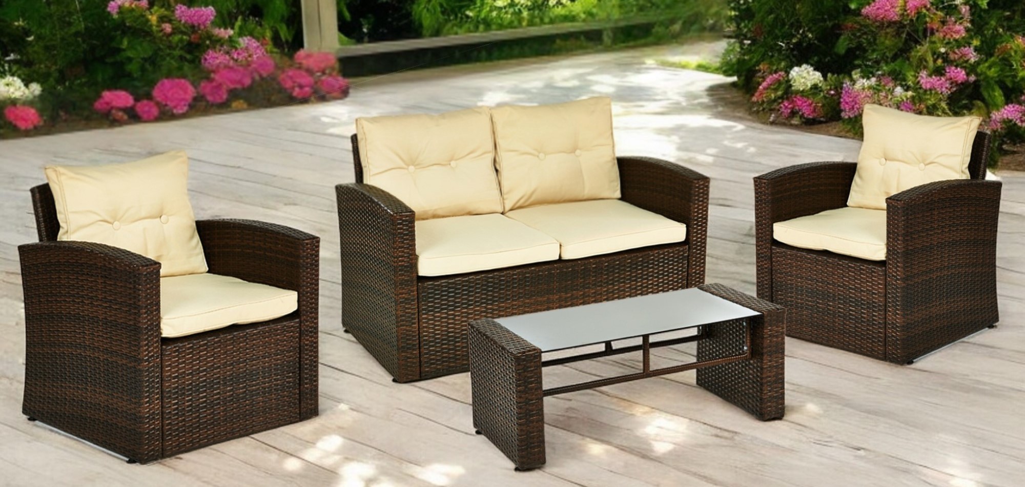 Four Piece Outdoor Brown Wicker Sofa Seating Group with Beige Cushions